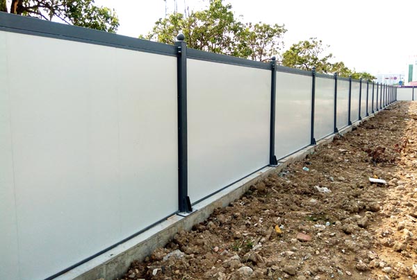 施工圍擋用白色彩鋼板作墻體,用藍(lán)色雙拼C型鋼作立柱,立柱頂部配藍(lán)色造型端蓋(可裝路燈),圍墻四周用藍(lán)色彩鋼框邊。高矮、大小、色澤一致。臟污后隨時可用水清洗擦拭。